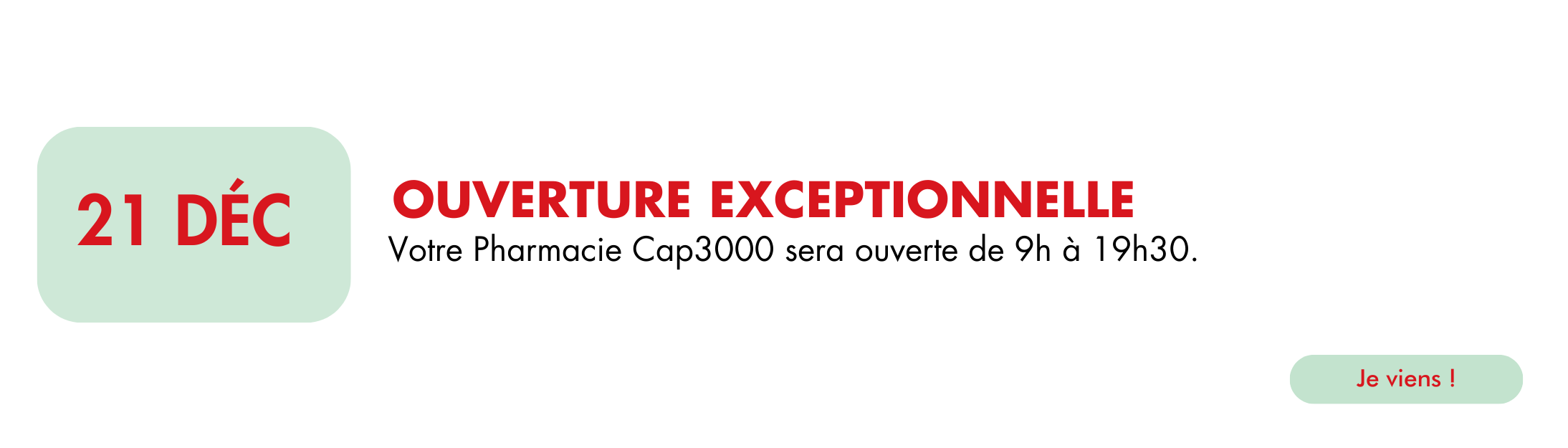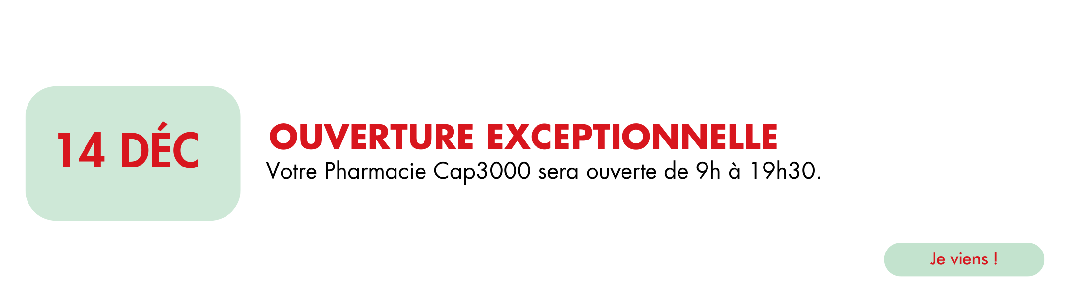 Votre pharmacie sera exceptionnellement ouverte les dimanches 14 et 21 décembre, de 9h à 19h30.
